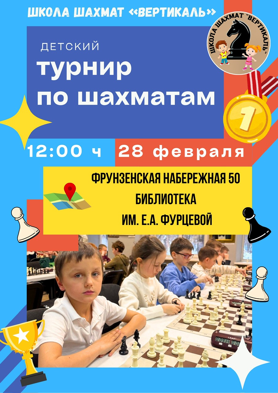 28 февраля (суббота) ШШ "Вертикаль" приглашает принять участие в турнире для начинающих по быстрым шахматам в уютной библиотеке им. Е.А.Фурцевой по адресу: Фрунзенская набережная 50.