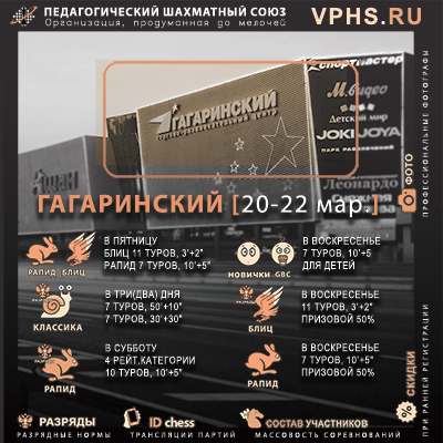 Регламент: 7 туров с контролем 10' + 3" каждому участнику. Начало 16:00. Регистрация 15:30 - 15:55. Обсчет рейтингов ФШР и РШТ.