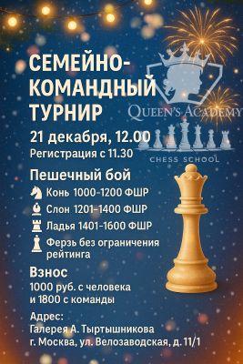 С 26 по 28 декабря приглашаем начинающих и PRO на детский турнир с классическим контролем времени с обсчетом ФШР. Играем в красивом и полностью обновленном после ремонта шахматном клубе с историей в самом центре Москвы. Взнос 2000 рублей за 3 игровых дня, многодетным дополнительная скидка 50%, то есть 1000 рублей за участника. Три рейтинговые категории, предусмотрены денежные призы! Количество мест ограничено - 60 человек