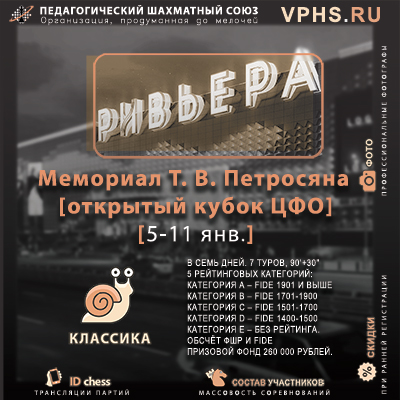 Педагогический Шахматный Союз приглашает на кубок Центрального Федерального Округа «Мемориал Т.В. Петросяна», который пройдет с 5 по 11 января 2026 года в ТРЦ «Ривьера».