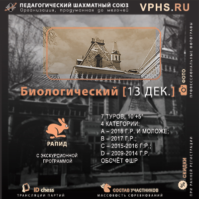 13 ДЕКАБРЯ ПШС приглашает Вас в Биологический музей имени К.А. Тимирязева! В программе турниры быстрым шахматам. В турнире смогут принять участие игроки различного возраста и с различным уровнем игры. Для всех детских категорий предусмотрена экскурсия.