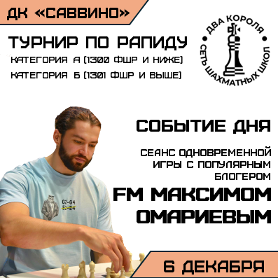 Данному мероприятию будет предшествовать традиционный Турнир по Рапиду. Участники, занявшие первые 5 мест в каждой категории (А, Б), получат возможность сыграть с Максимом Омариевым в сеансе одновременной игры.