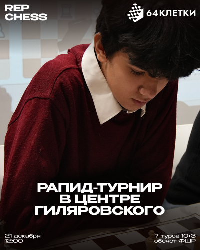 21 декабря в 12:00 64 клетки и Rep Chess проводят открытый рапид-турнир в Центре Гиляровского с обсчетом рейтингов ФШР и РШТ.