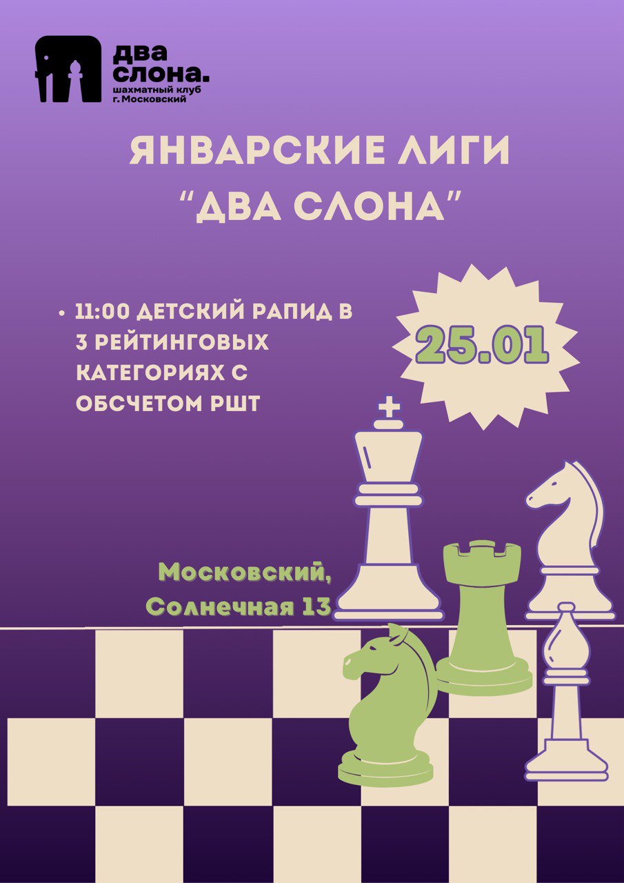 25 января в шахматном клубе "Два слона" в Московском пройдет турнир в 3 рейтинговых категориях.