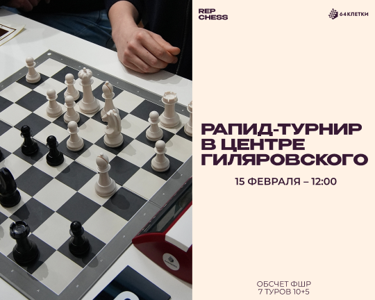 15 февраля в 12:00 64 клетки и Rep Chess проводят открытый рапид-турнир в Центре Гиляровского с обсчетом рейтингов ФШР и РШТ.