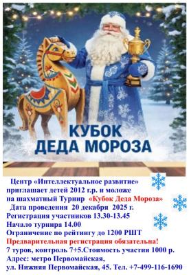 Шахматный Турнир «Кубок Деда Мороза» 20 декабря 2025 г. Регистрация участников 13.30-13.45 Начало турнира 14.00