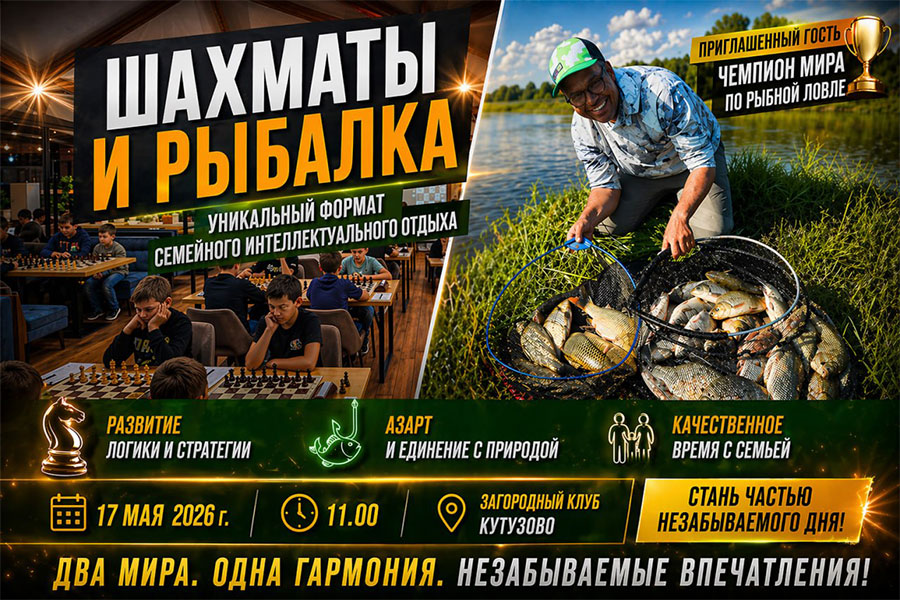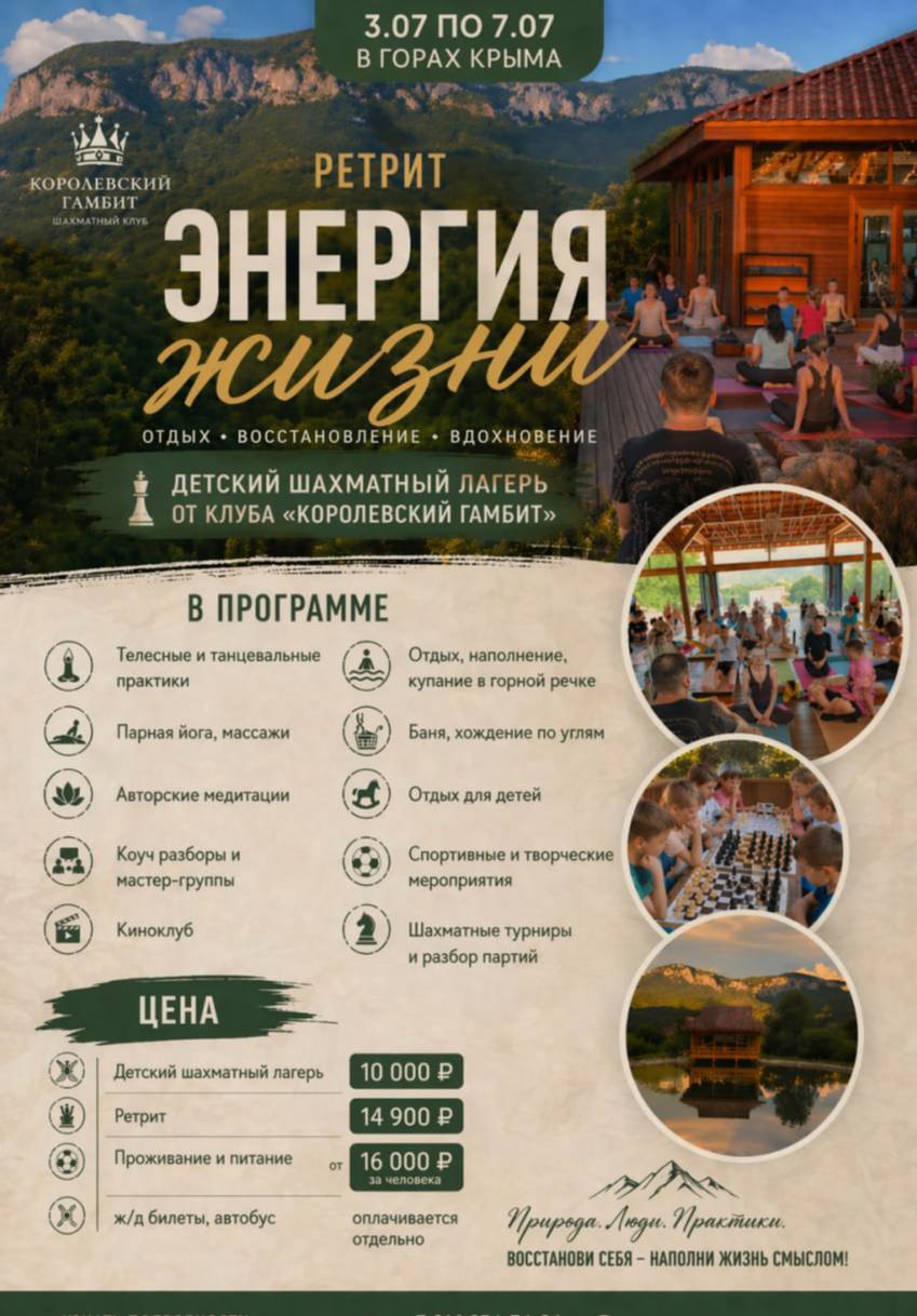 Шахматные занятия с опытными тренерами, турнир по классическим шахматам с обсчётом рейтингов ФШР и РШТ, анализ партий, рапид-турнир, блиц, конкурс шахматных задач, творческая программа: "Что? Где? Когда?", викторины, квесты, конкурсы, прогулки по лесу, спортивные состязания в большом зале, детская сауна, мини-бассейн, футбол. Проживание в комфортабельных 2-х местных номерах