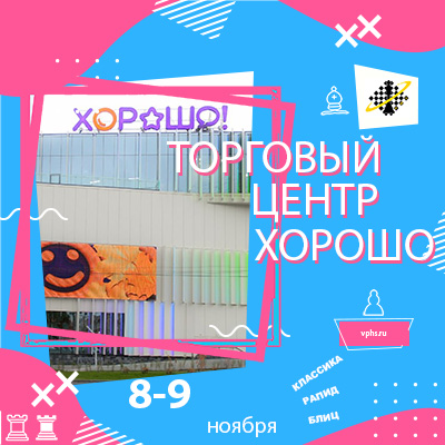 8-9 НОЯБРЯ ПШС приглашает Вас в ТРЦ "ХОРОШО"! В программе турниры по классическим и быстрым шахматам. В турнире смогут принять участие игроки различного возраста и с различным уровнем игры.