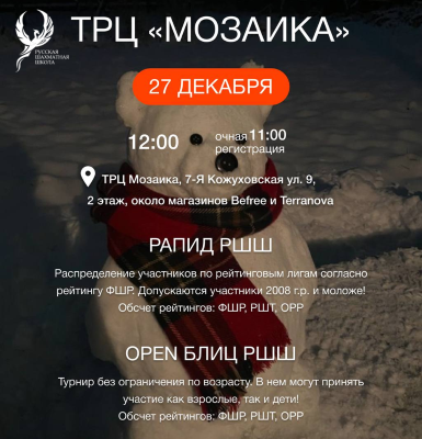 28 декабря в 12:00 Русская шахматная школа проводит турниры в ТРЦ "МОЗАИКА"!