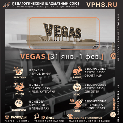 31 ЯНВАРЯ - 1 ФЕВРАРЯ ПШС приглашает Вас в ТРК "VEGAS"! В программе разрядные турниры по классическим шахматам, блицу и рапиду. В турнире смогут принять участие игроки различного возраста и с различным уровнем игры.