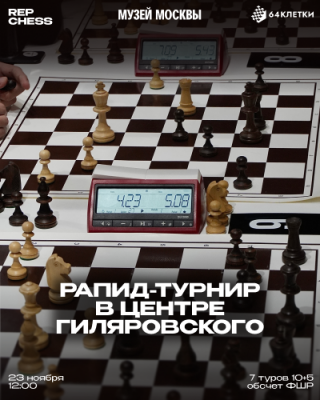 23 ноября в 12:00 64 клетки и Rep Chess проводят открытый рапид-турнир в Центре Гиляровского с обсчетом рейтингов ФШР и РШТ.