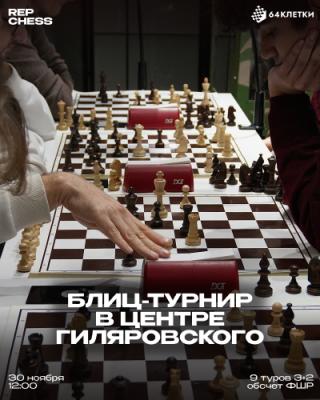 30 ноября в 12:00 64 клетки и Rep Chess проводят открытый блиц-турнир в Центре Гиляровского с обсчетом рейтингов ФШР и РШТ.