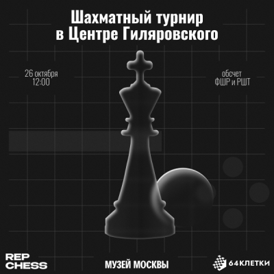 26 октября в 12:00 64 клетки и Rep Chess проводят открытый рапид-турнир в Центре Гиляровского с обсчетом рейтингов ФШР и РШТ.