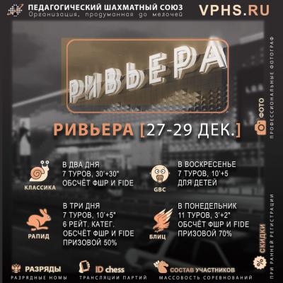 27, 28 и 29 декабря ПШС приглашает Вас в ТРЦ "Ривьера"! В программе турниры по классическим и быстрым шахматам. В турнире смогут принять участие игроки различного возраста и с различным уровнем игры.