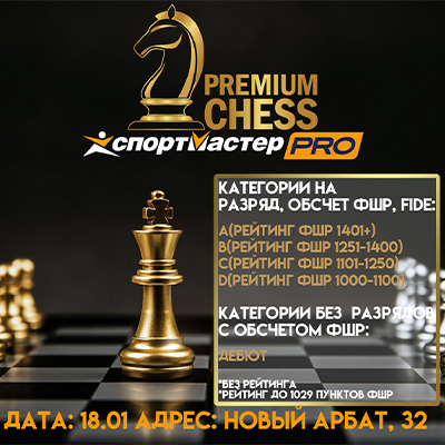 С 16 января по 6 февраля (по пятницам) приглашаем начинающих и PRO на детский турнир с классическим контролем времени с обсчетом ФШР. Играем в красивом и полностью обновленном после ремонта шахматном клубе с историей в самом центре Москвы. Взнос 2000 рублей за 4 игровых дня, многодетным дополнительная скидка 50%, то есть 1000 рублей за участника. Три рейтинговые категории, предусмотрены денежные призы! Количество мест ограничено - 60 человек