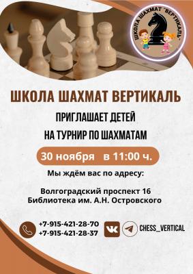 30 ноября (воскресенье) ШШ "Вертикаль" приглашает принять участие в турнире для начинающих по быстрым шахматам в библиотеке им. А.Н.Островского (отдел им.Гааза) по адресу: Волгоградский проспект 16.