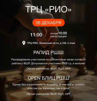 06 декабря в 11:00 Русская шахматная школа проводит турниры в ТРЦ "РИО"!