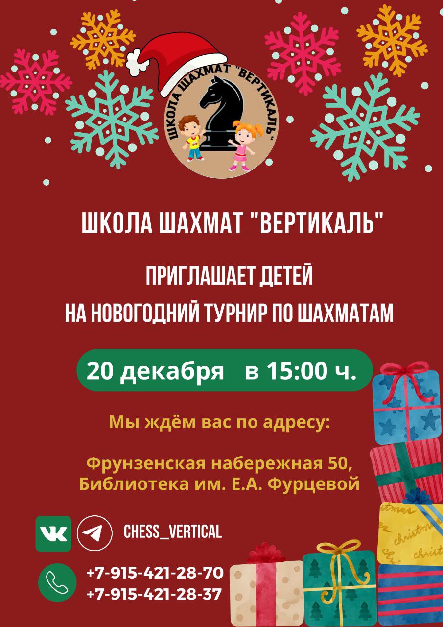 20 декабря (суббота) Шахматная Школа "Вертикаль" приглашает принять участие в Новогоднем турнире по быстрым шахматам.